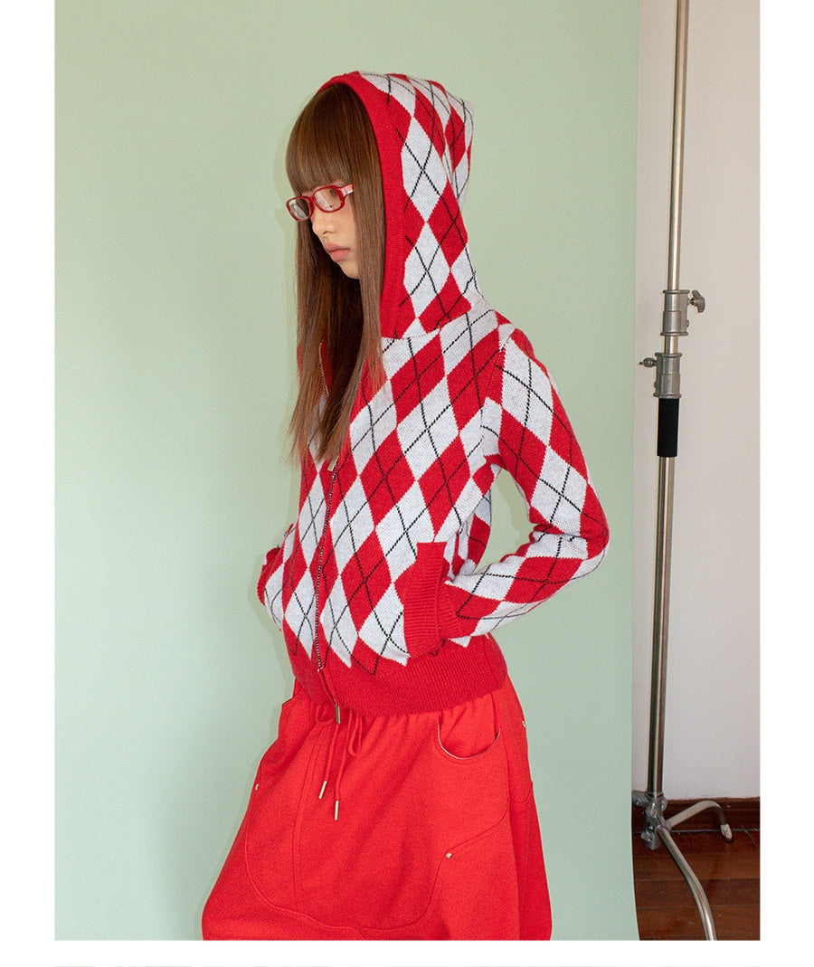 DIAMOND DOUBLE ZIP HOODED KNIT COAT
