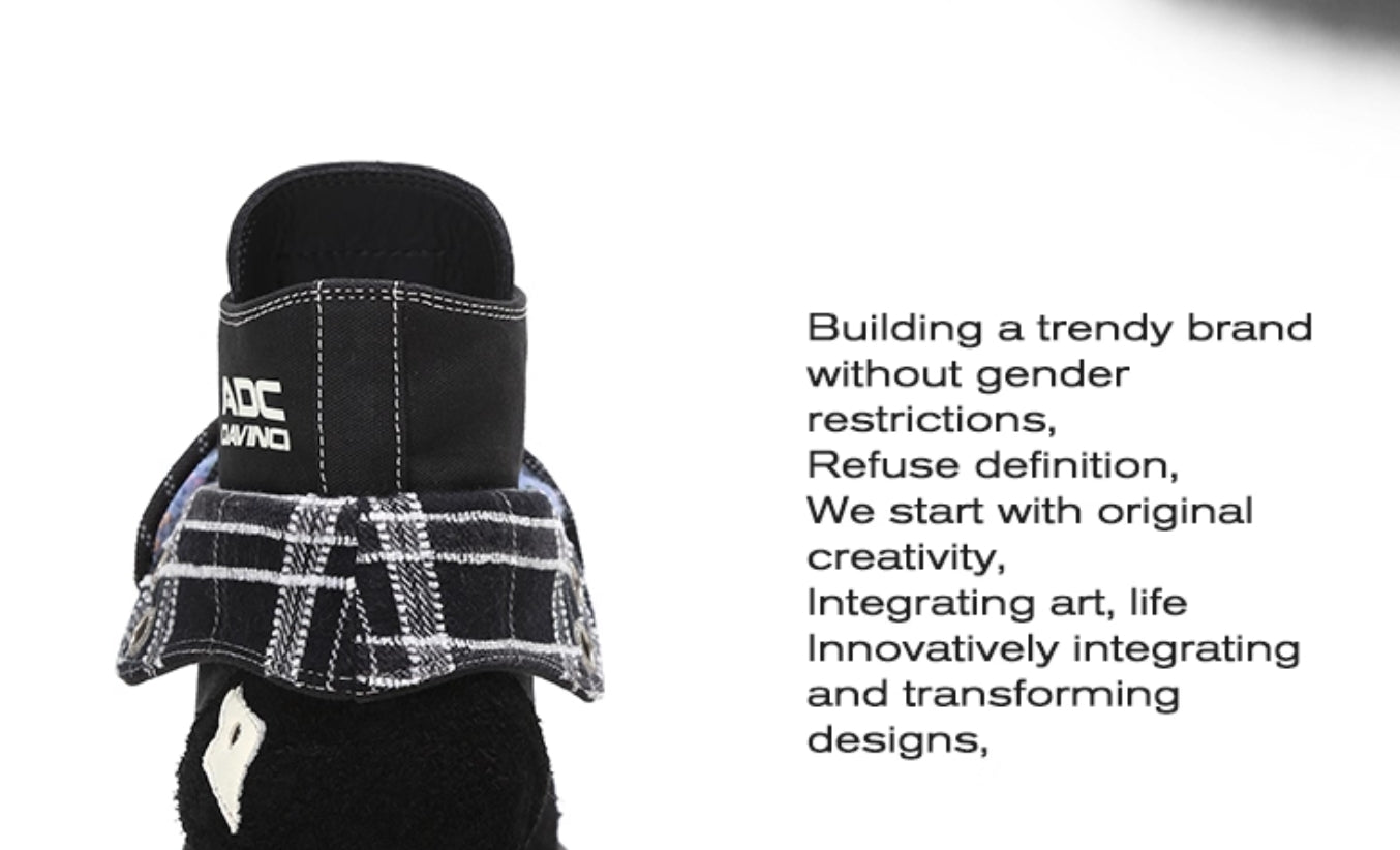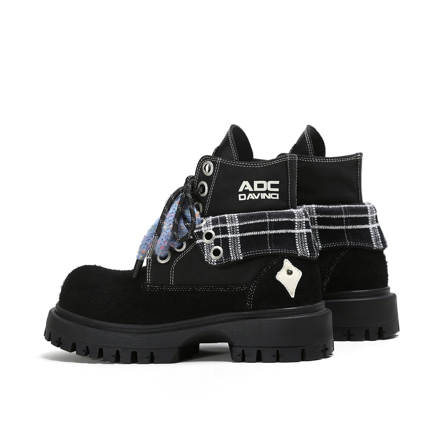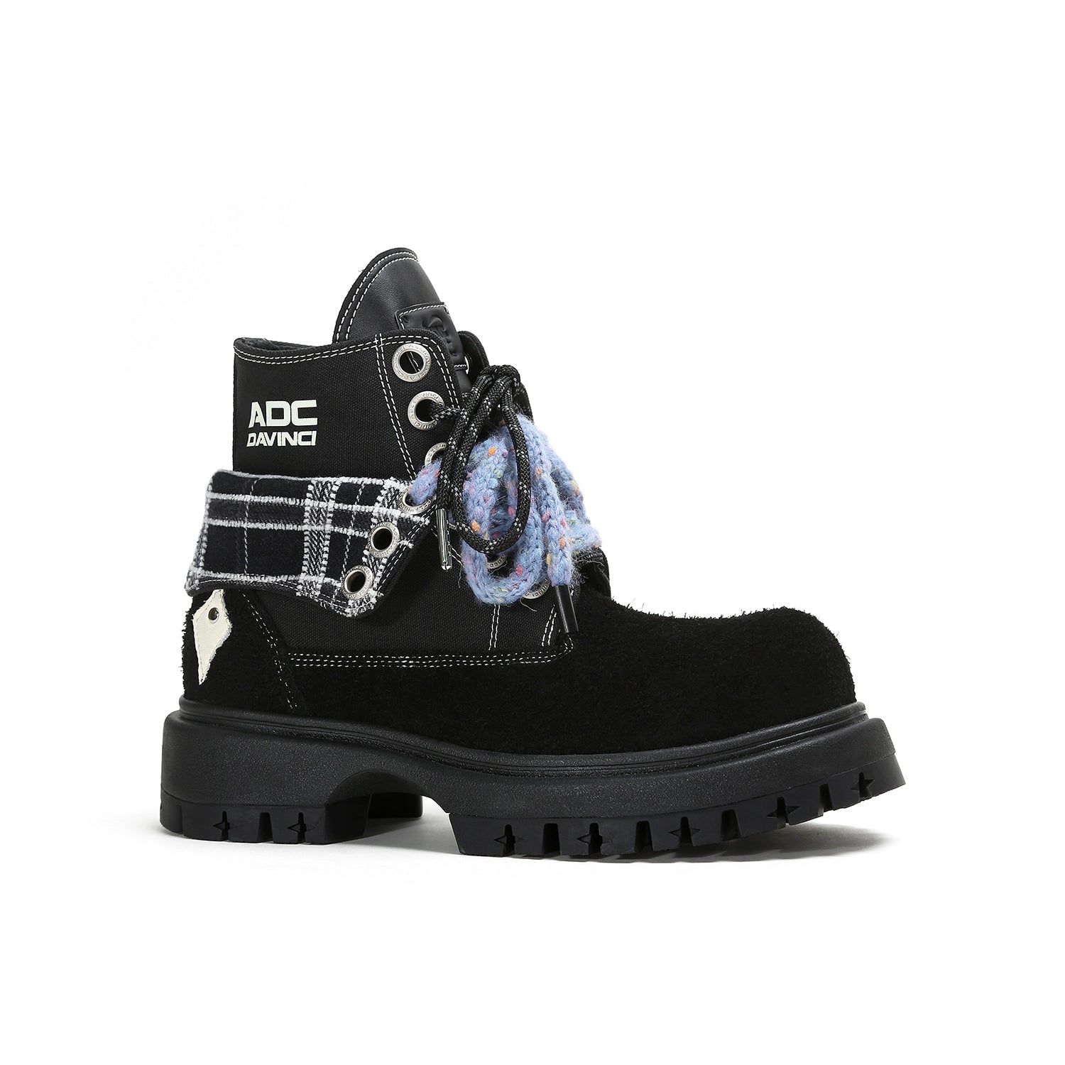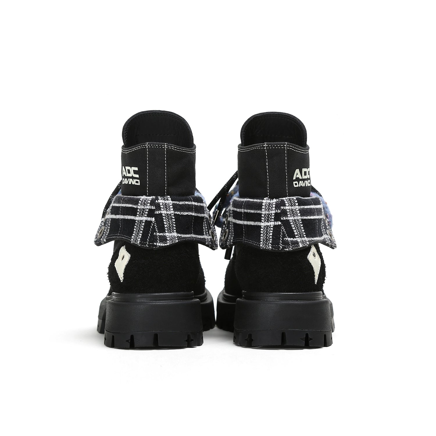 ブラックベースのレースアップブーツに、履き口のチェック柄を組み合わせた一足。